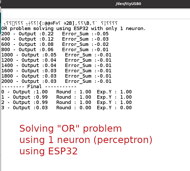 Serial.println("OR problem solving using ESP32 with only 1 neuron.");