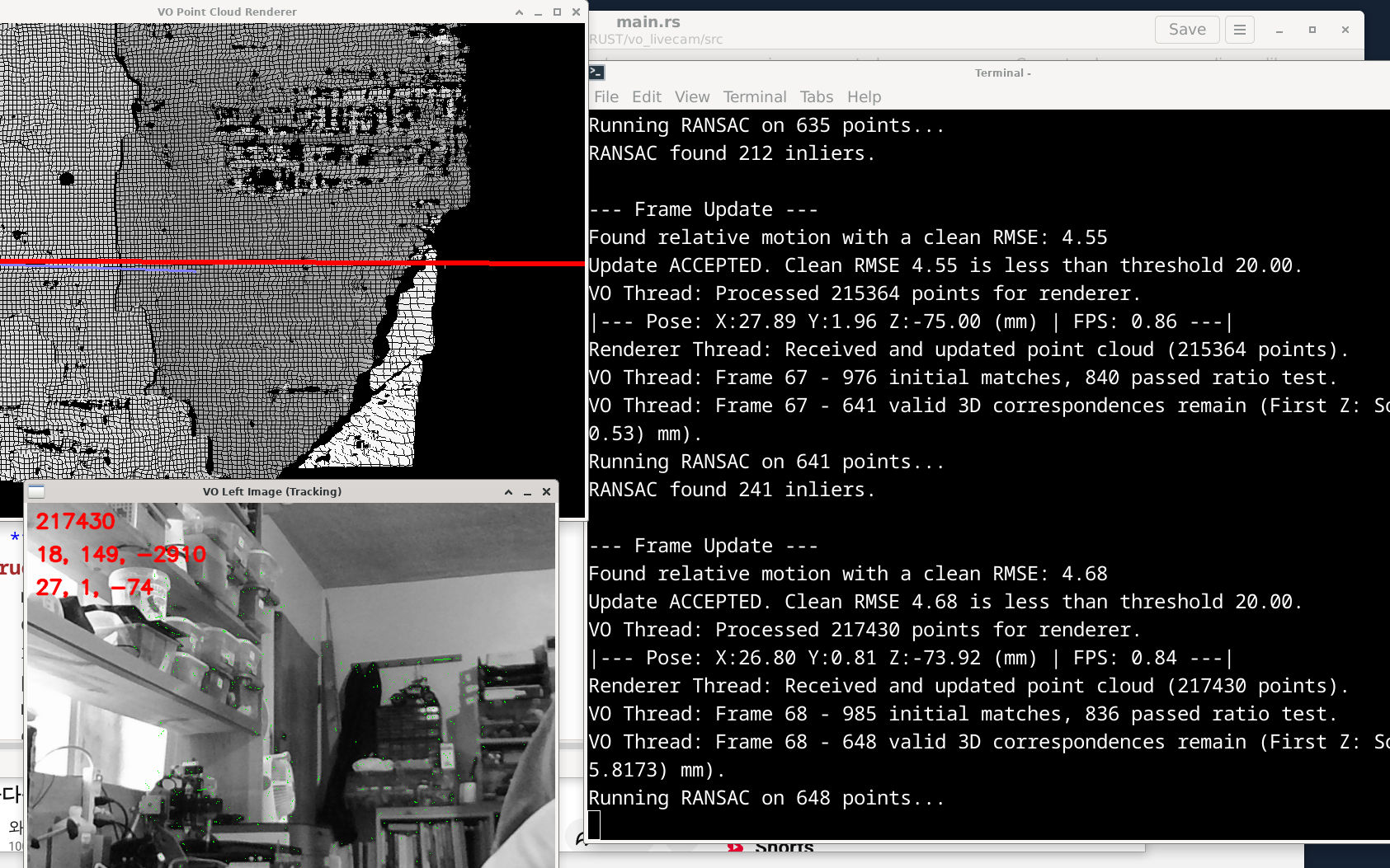 - odom.update(): 이 리스트를 Odometry 클래스로 보냅니다. 이 클래스는 RANSAC 알고리즘을 사용하여 이 모든 점들의 움직임을 가장 잘 설명하는 최적의 회전(R) 및 이동(t) 값을 찾습니다. 그런 다음, 이 움직임을 global_rotation과 global_translation에 누적하여 처음 시작점으로부터의 현재 위치를 계속 추적합니다.